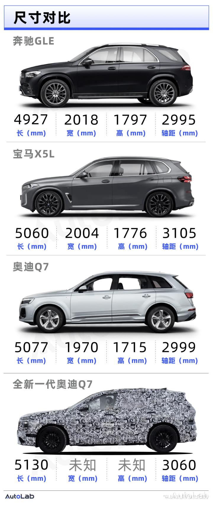 作为对比,我们也罗列了它的两位老对手宝马X5和奥迪Q7的尺寸信息。
